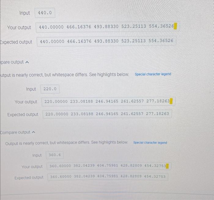 utput is nigh right, but whitespace differs. Run into highlights below. Input Your output \( 220.00000 \quad 233.08188 \quad 246.94165 \quad 261.62557 \quad 277.18263 \) Expected output \( 220.00000233 .08188 \quad 246.94165 \quad 261.62557 .277 .18263 \)